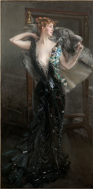 Ritratta a grandezza naturale, il volto di profilo che spicca contro la psyche alle sue spalle, la luce che esalta il candore del décolleté segnato dall’importante scollatura dell’abito che segue la linea sinuosa del corpo: la pittura di Boldini diventa uno scintillio di luce a rendere le perline e le decorazioni del lungo abito nero che avvolge il corpo della donna.