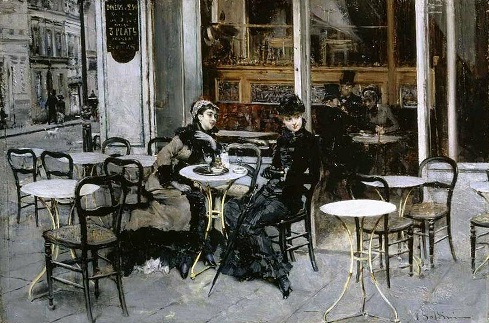 Ecco allora Conversazione al caffè, eseguito un anno prima, dove Boldini ritrae le due donne sedute in un caffè parigino a dialogare: due donne completamente diverse, la schiva e bionda Berthe che sembra quasi infastidita dall’esuberanza della de Rasty, e quest’ultima bruna, esuberante, che invade lo spazio dell’altra.